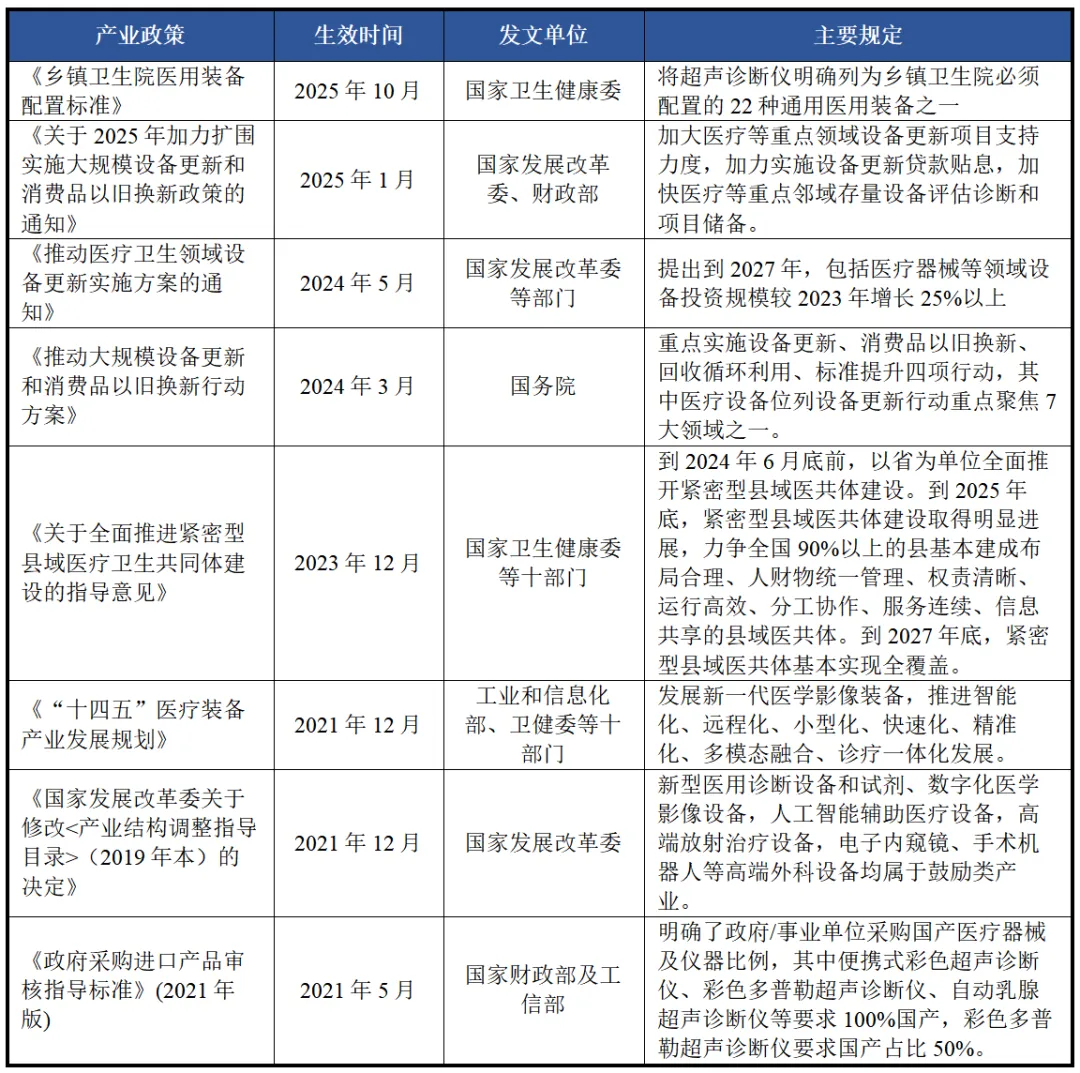 (1)定义医疗彩超设备,全称为彩色多普勒超声诊断设备,是一种结合超声波成像技术和彩色多普勒血流显像技术的医疗影像设备,广泛应用于对人体腹部、心脏、血管、浅表器官(如甲状腺、乳腺)、妇产科等领域的检查。(2)行业影响因素医疗彩超的发展受到政策、宏观经济等多方面因素影响。