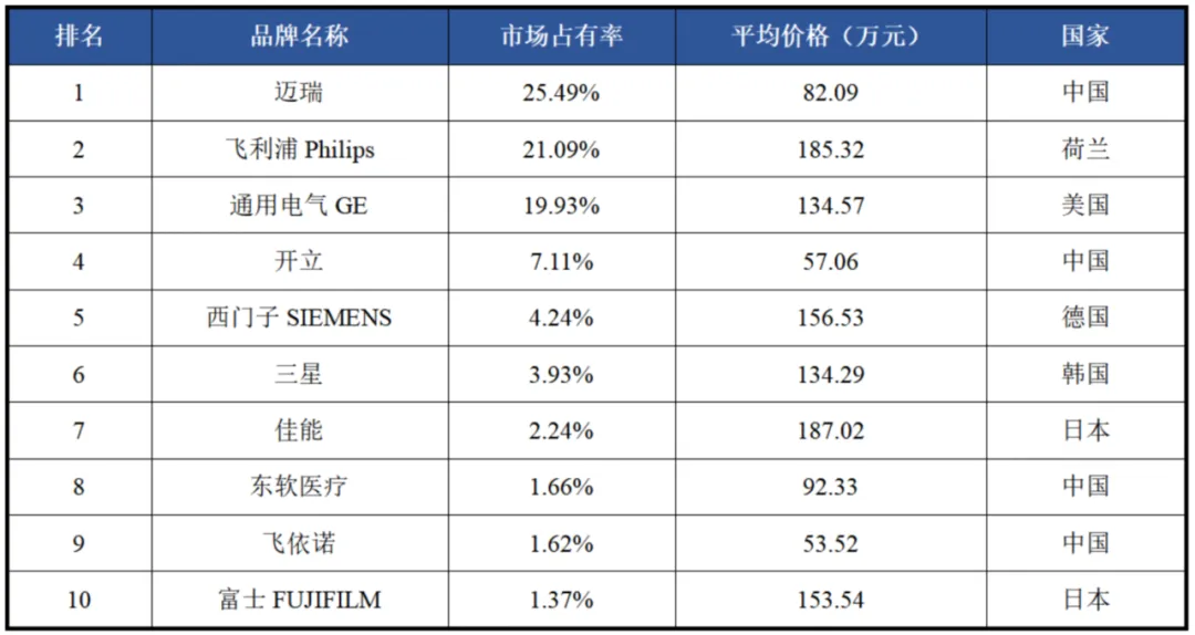 国内彩超市场呈“双龙头”格局,迈瑞医疗与开立医疗领跑国产阵营。高端领域仍由GE、飞利浦等进口品牌主导,但国产设备在中低端及便携市场占据优势,国产化率稳步提升至46.4%。