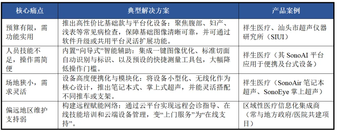 针对基层医疗机构的预算、人员、空间及维护支持四大核心痛点,国产中低端彩超的解决方案核心逻辑是:通过极致的性价比设计、深度的操作简化和创新的服务模式,在有限条件下实现基本诊疗能力的可靠、便捷覆盖,形成了差异化的专业厂商阵营。