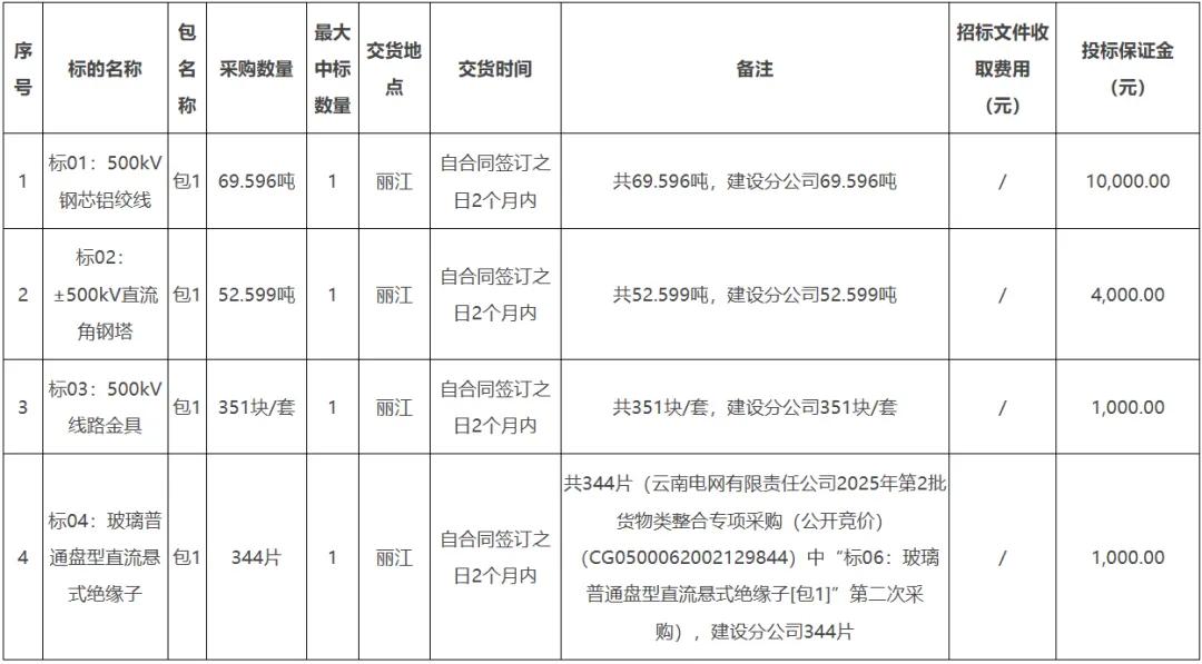 2.1项目概述:主要为纳入公司2025年固定资产基建项目物资,包括500kV钢芯铝绞线、±500kV直流角钢塔、500kV线路金具等设备。