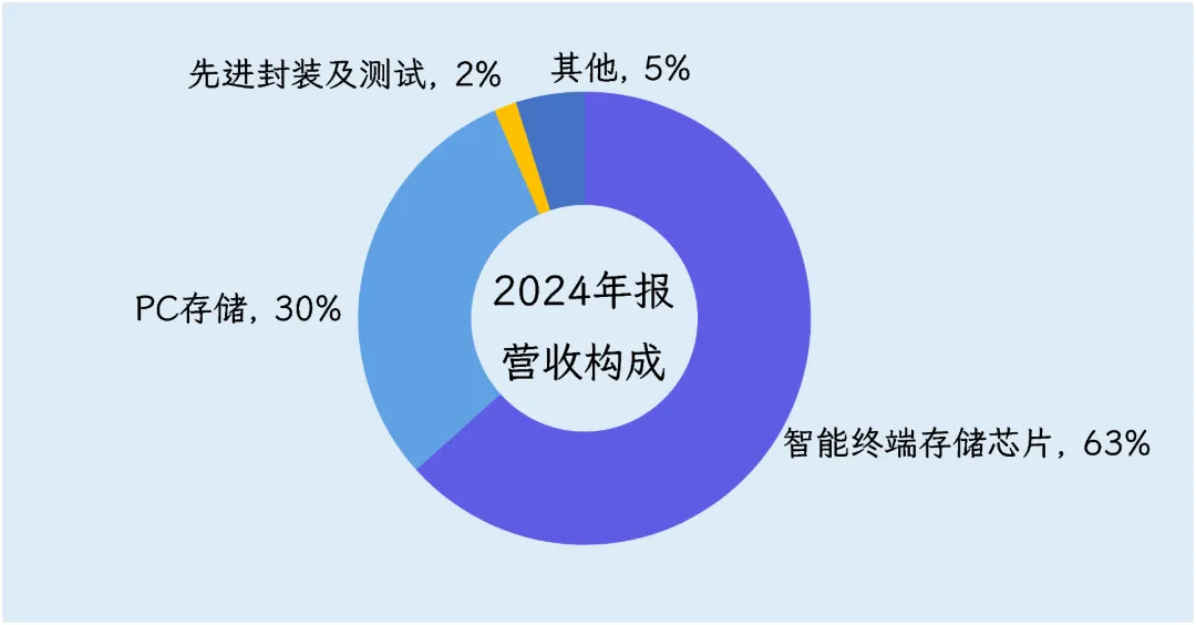 2024年,公司营收66.95亿元,其中最大的收入来源是智能终端存储芯片,占总营收的63%,毛利率17.9%。这类产品就是把NAND和DRAM两种晶圆片叠加封装成一颗芯片,主要用在智能设备上,负责数据存储和运行内存。核心客户包括OPPO、传音、摩托罗拉这些手机厂商,以及Meta、小米、小天才、谷歌这些智能穿戴品牌。