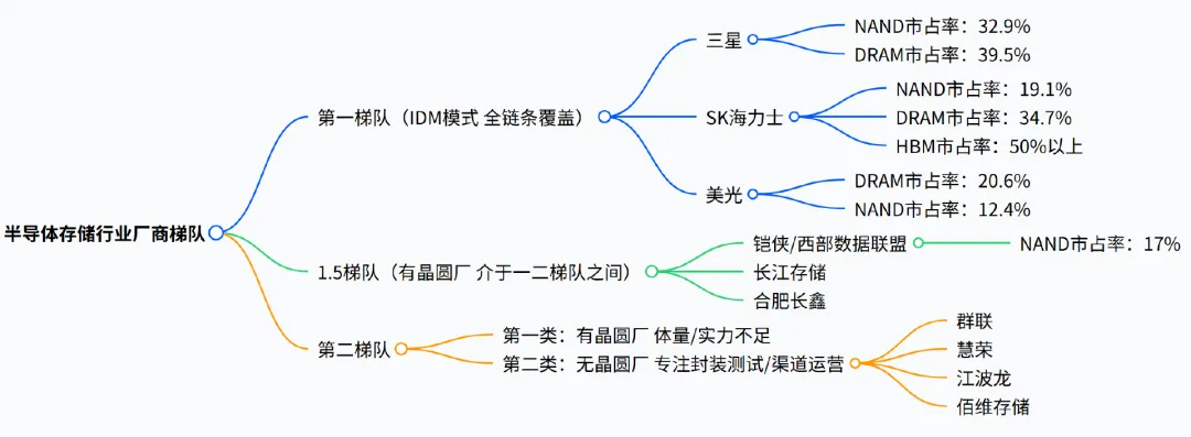 目前行业第一梯队被三家巨头牢牢占据,它们都属于IDM模式企业,也就是从晶圆制造、芯片设计到成品销售全链条覆盖的企业,分别是三星、SK海力士和美光。