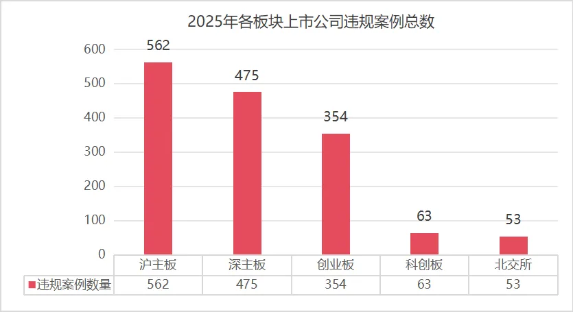 2025年度,监管机构对沪主板公司及相关主体作出562例处罚,深主板公司及相关主体475例,创业板公司及相关主体354例,科创板公司及相关主体63例,北交所公司及相关主体53例。