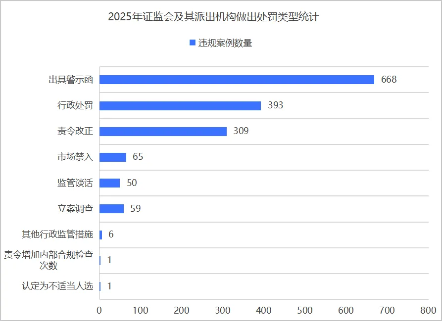 2025年,中国证监会及其派出机构对上市公司及相关主体作出1314个处罚,涉及上市公司660家。根据上述图表统计显示,上市公司及相关主体收到证监会及其派出机构的处罚主要为出具警示函(668个)、行政处罚(393个)及责令改正(309个)。