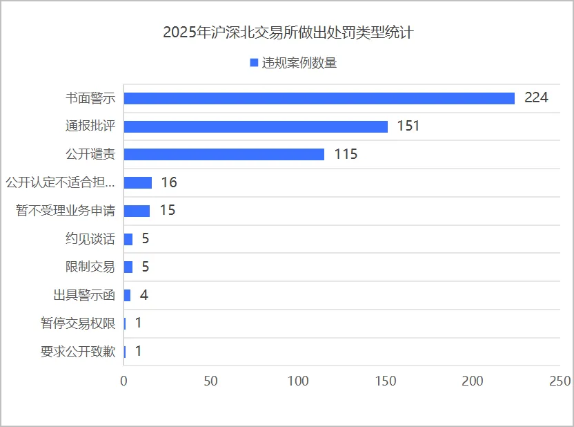 2025年,沪深北交易所对上市公司及相关主体作出475个处罚,涉及上市公司328家。根据上述图表统计显示,上市公司及相关主体收到沪深北交易所的处罚主要为书面警示(224个)、通报批评(151个)及公开谴责(115个)。