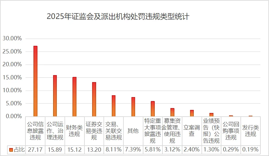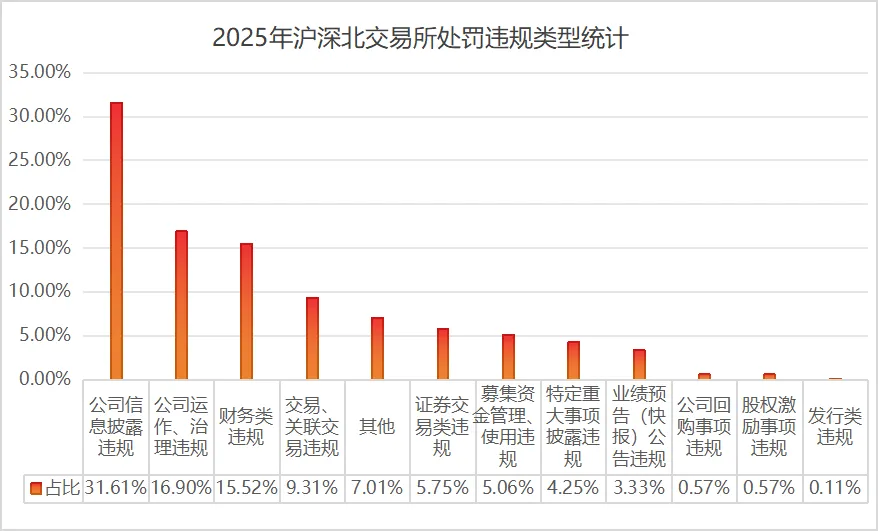 2025年证监会及其派出机构、沪深北交易所对上市公司及相关主体实施处罚的案例事由如下图所示,其中,2025年上市公司前五大违规类型分别为公司信息披露违规、公司运作、治理违规、财务类违规、证券交易类违规、其他。