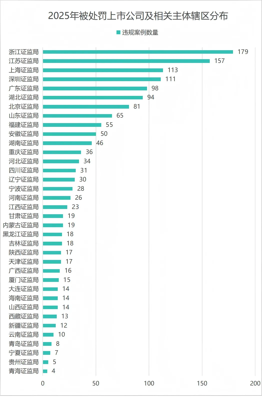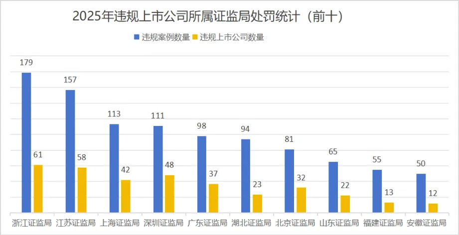2025年,中国证监会及其派出机构、沪深北交易所处罚案例数量最多的前五个地区为广东(包括深圳)、浙江(包括宁波)、江苏、上海、湖北,合计处罚案例占59.18%。