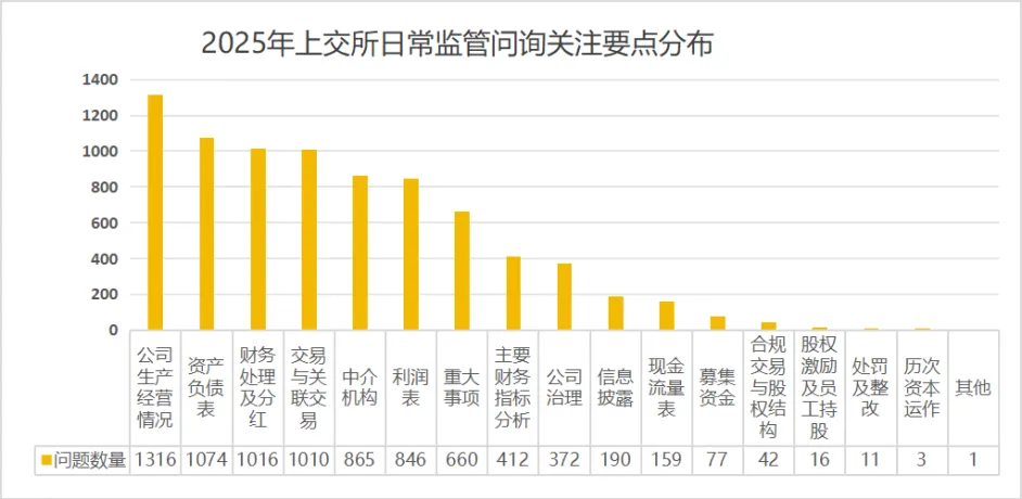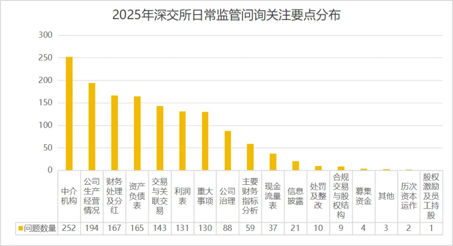 交易所在日常监管问询中主要关注上市公司的公司生产经营情况、交易与关联交易、资产负责表、财务处理及分红、利润表等方面问题。