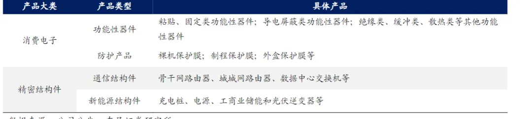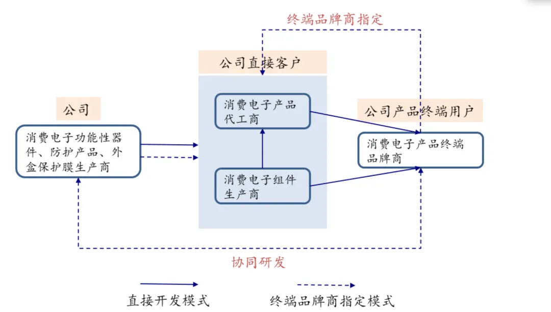 恒铭达于2011年7月27日成立,2019年登录深交所主板,目前市值88亿。股票代码为002947恒铭达成立以来最初的业务是模切件领域,至今仍然通过模切领域带来主要的营收和利润。通过研报可以看到公司主营业务的范围整体看来主要是给消费电子产品提供一些保护零部件和功能零部件,最后集成到包括手机电脑平板等产品。在功能件上面,本质上是对一些原材料拿来按照设备需要,进行不同定制化或者标准化的模切,便于集成进入电子设备,中间由于不同设备需要的特点不同,功能件需要对原材料进行不同原材料进行加工,组合来实现满足下游客户的需求。防护件方面其实就是做消费电子方面的一些保护膜保护套,本质上来讲,技术优势并不是核心,核心应该还是在于规模优势以及供应链优势。这类工业产品成品的中间件供应商往往在不出意外的条件下和下游客户会保持长期的合作供应关系。所以我们可以看一下恒铭达的主要客户:公司直接客户为知名消费电子产品制造服务商、组件生产商,客户质量优异合作关系稳固。
