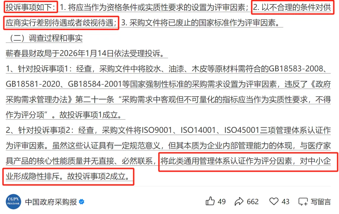 ISO9001、ISO14001、ISO45001三项认证能否作为招标评审因素? 核心结论:可作为加分项,不可作资格门槛,且需满足强关联性要求。 政策依据: 一是《政府采购法实施条例》第二十条,禁止以非强制认证设资格条件排斥供应商; 二是《政府采购货物和服务招标投标管理办法》第五十五条,评审因素须与标的质量、履约能力相关; 三是《政府采购需求管理办法》,明确评审因素应贴合项目特点与实际需求。 实务中需注意: 仅能作为商务加分项,分值不宜过高(不宜超过3分);需证明与项目质量、环保、安全等核心需求强相关;避免对中小企业构成歧视,确保足够供应商参与竞争。违规设置可能被认定为差别待遇,引发投诉。 延伸阅读: 1、消防装备产品标准合集:装备产品标准 2、消防装备配置标准合集:装备配置标准 3、消防员国家职业技能鉴定:国家职业技能鉴定(消防员) 4、消防三定:消防三定 5、消防员转业安置资料合集:消防员转业安置