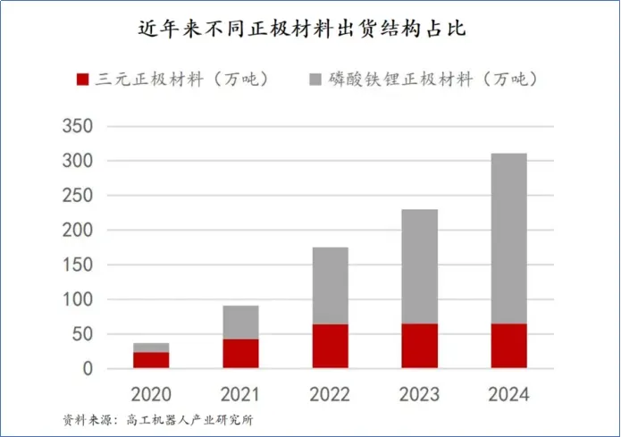 数据显示,2024年我国正极材料出货量335万吨,其中磷酸铁锂材料出货246万吨,同比增长49%,占正极材料总出货量比例近74%。