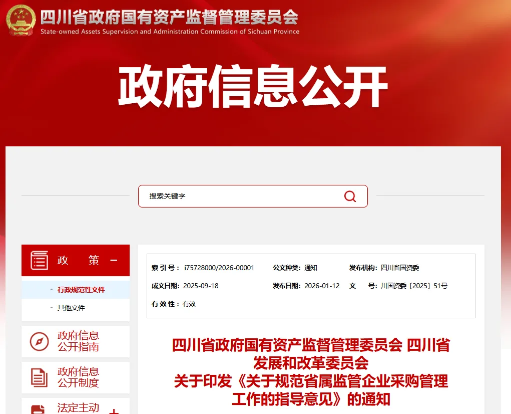 近日,四川省政府国有资产监督管理委员会、四川省发展和改革委员会印发《关于规范省属监管企业采购管理工作的指导意见》(简称《指导意见》)。