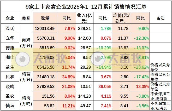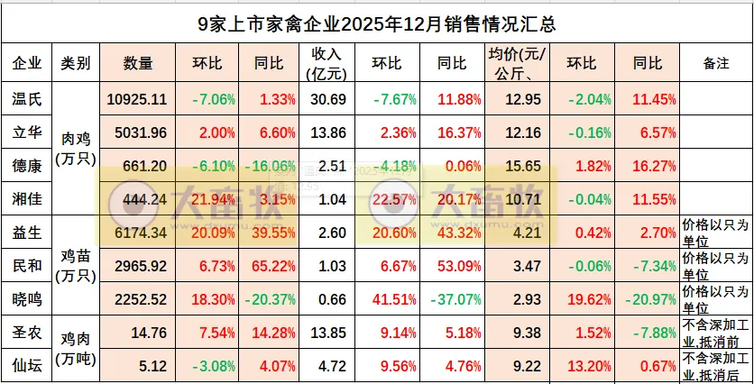 从9家上市企业的2025年12月家禽销售数据来看,12月销售数量和收入同环比均以增长为主,