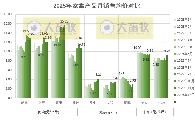 近日,大畜牧小编收集汇总了9家上市家禽企业2025年12月家禽产品销售情况,其中温氏、立华、德康和湘佳主要是黄羽肉鸡销售,益生和民和主要是白羽鸡苗销售,晓鸣主要是蛋鸡苗销售,圣农和仙坛主要是白羽鸡肉销售。