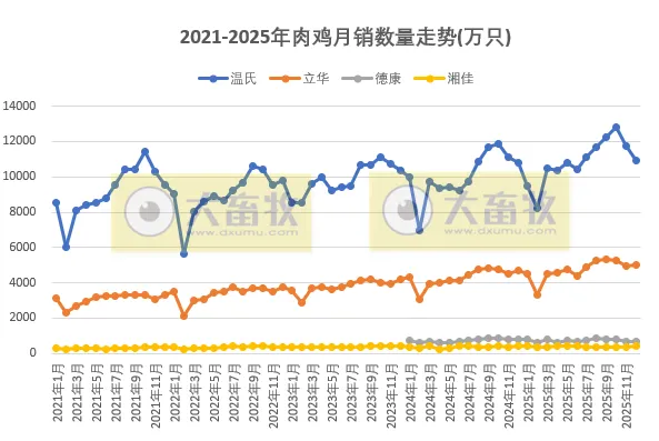 其中温氏、立华和湘佳2025年度销量均创历史新高,而温氏突破13亿只。