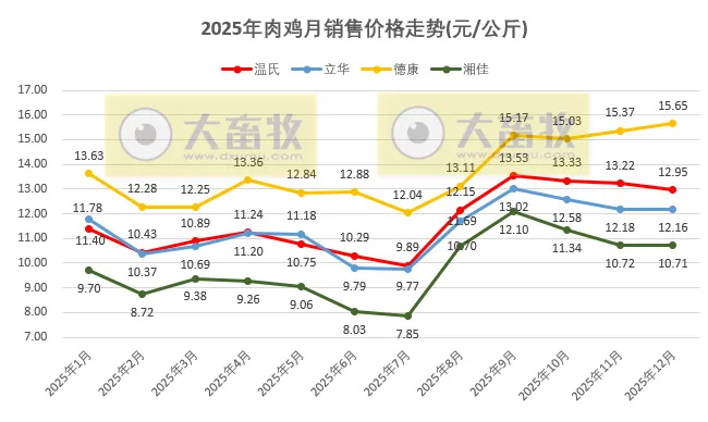 2025年12月肉鸡销量方面,立华和湘佳同环比均增长,德康同环比均减少;