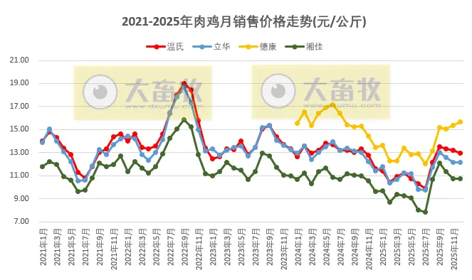 温氏、立华、德康和湘佳2025年12月黄羽肉鸡销售情况出现分歧,而2025年度黄羽肉鸡销售情况仍然一致。