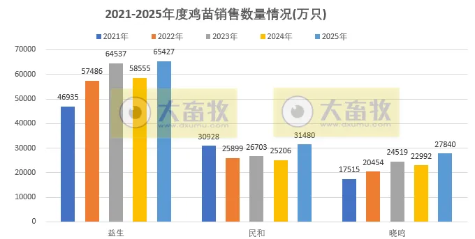 其中益生和晓鸣2025年度销量均创历史新高,民和也是近5年最高。