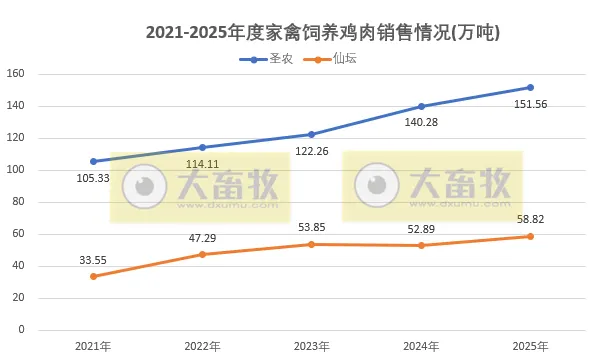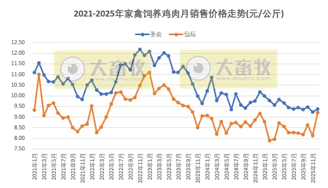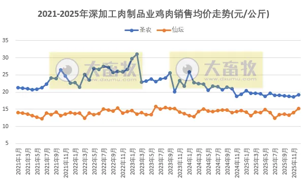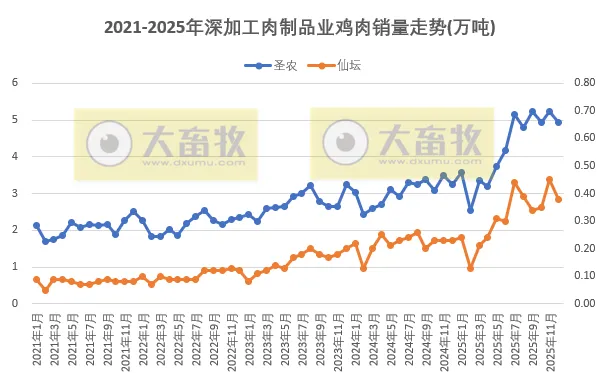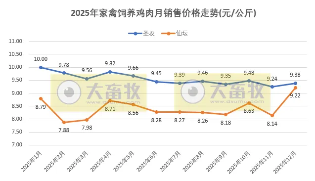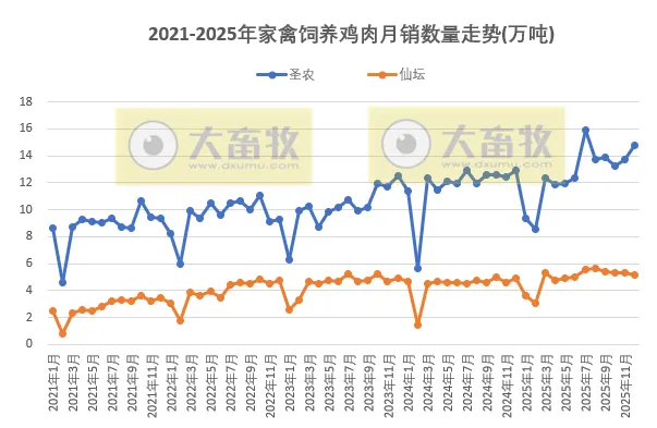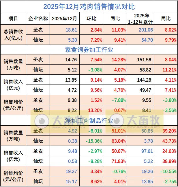 2025年12月,圣农和仙坛2家企业销售情况,家禽饲养行业和深加工行业销售走势基本为一致;年度两个板块的销售情况走势也基本一致。