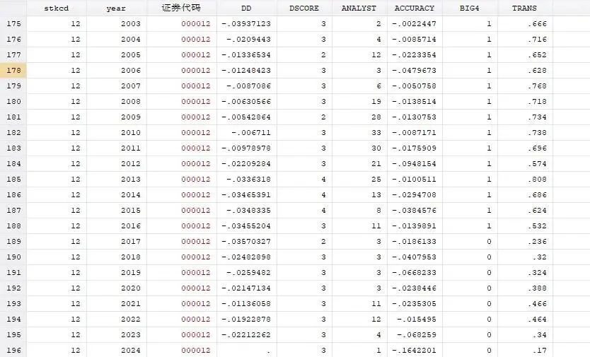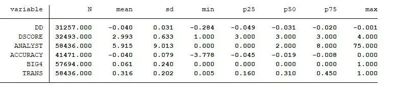 :先计算同一年不同分析师预测的每股盈余的中位数,然后减去实际每股盈余,再除于上年度的每股股价。然后将这一数值取绝对值并乘以-1,得到ACCURACY。这样,ACCURACY越大,分析师盈余预测越准确。分析师盈余预测越准确,信息透明度可能越高。