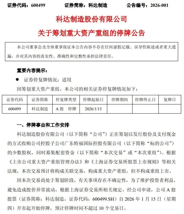 2026年1月15日,科达制造(600499.SH)正式发布停牌公告,科达制造拟发行股份及支付现金,收购核心海外建材平台广东特福国际少数股权并募集配套资金,交易构成重大关联资产重组(不构成重组上市)。公司股票自 1 月 15 日起停牌,预计不超 10 个交易日,此举被解读为强化核心业务控制权、加速全球化的关键动作。