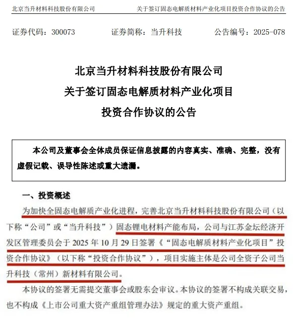 2025年10月,当升科技已发布公告,宣布与江苏金坛经济开发区管理委员会签署《“固态电解质材料产业化项目”投资合作协议》。项目实施主体为当升科技全资子公司——当升科技(常州)新材料有限公司。
