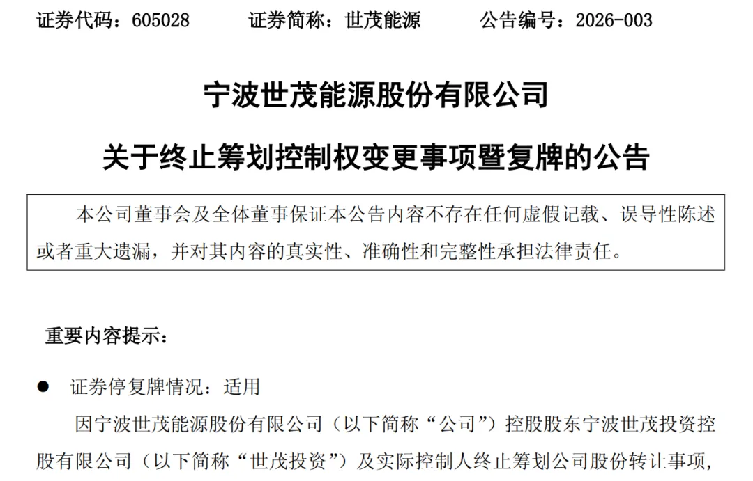 环卫科技网讯,世茂能源(605028)1月17日发布公告,宣布公司控股股东宁波世茂投资控股有限公司(以下简称“世茂投资”)及实际控制人终止筹划公司股份转让事项。