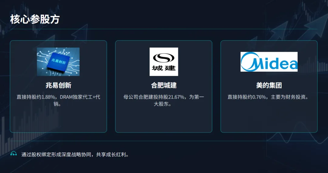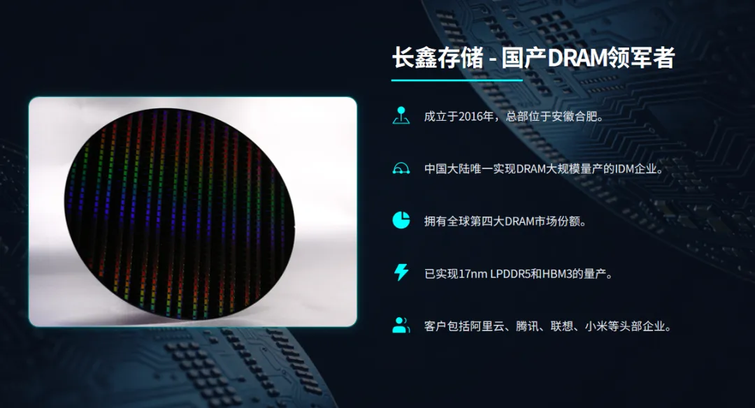 它是中国大陆唯一实现 DRAM 芯片大规模量产的 IDM 企业; 全球第四大 DRAM 厂商; 拥有合肥、北京三座晶圆厂; 主流产品包括 LPDDR5、DDR5、DDR4、DDR5、HBM; 2026 年初正式递交 IPO 申请,拟融资 295 亿元。
