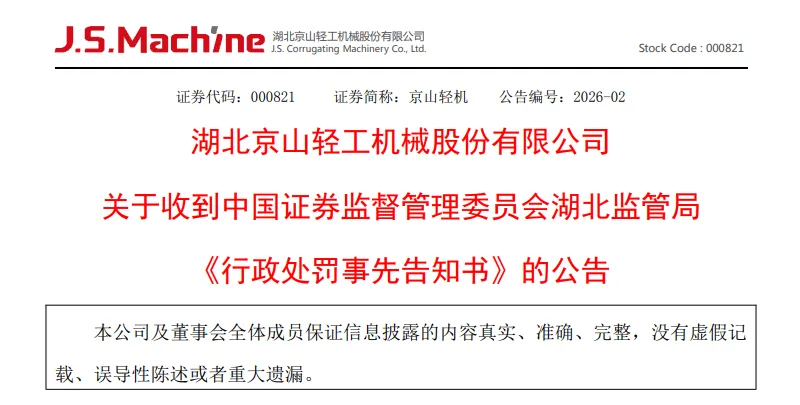 京山轻机于2015年至2018年分步投资慧大成股权,自2018年2月开始持有慧大成51%股权,2018年京山轻机将慧大成纳入合并报表范围。2018年,慧大成及其全资子公司京山京慧智能科技有限公司通过与客户签订虚假合同、将未实际履行的合同确认收入等方式,虚增营业收入5,819.22万元,虚增营业成本960.10万元,扣除资产减值损失影响后,导致京山轻机2018年虚增利润总额4,670.46万元,占京山轻机当期披露利润总额的25.49%。京山轻机披露的2018年年度报告存在虚假记载。2021年6月22日,京山轻机披露《京山轻机非公开发行股票发行情况报告书暨上市公告书》,引用了2018年年度报告中存在虚假的财务数据。2026年1月16日晚,京山轻机(000821)发布公告,公司及相关责任人于2026年1月16日收到湖北证监局出具的《行政处罚事先告知书》。因公司披露的《2018年年度报告》存在虚假记载,深交所将对公司股票实施其他风险警示。公司股票将自1月19日开市起停牌1天,自1月20日开市起复牌并被实施其他风险警示,股票简称由“京山轻机”变更为“ST京机”。“公司对此表示诚恳接受,并就该历史问题给市场带来的困扰致歉。”1月17日,京山轻机相关负责人回应记者采访时表示,处罚所涉为早已完结的子公司历史事项,已通过司法及财务手段彻底解决,对公司当前经营与财务状况无重大影响。当前,京山轻机主营业务——光伏、包装及锂电池智能装备三大板块运行稳健,公司正全力聚焦主业发展,并已启动全面的内控升级计划。