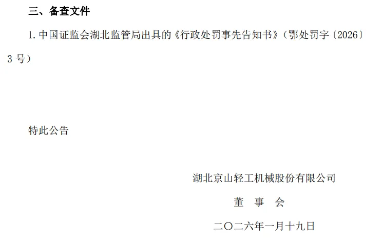 湖北京山轻工机械股份有限公司(以下简称“公司”)于2024年11月1日收到中国证券监督管理委员会(以下简称“中国证监会”)下发的《立案告知书》(编号:证监立案字 0052024008 号),因公司涉嫌信息披露违法违规,根据《中华人民共和国证券法》《中华人民共和国行政处罚法》等法律法规,中国证监会决定对公司立案。具体内容详见公司于2024年11月2日在《证券时报》《中国证券报》《上海证券报》《证券日报》和巨潮资讯网(www.cninfo.com.cn)上公告的《关于收到中国证券监督管理委员会<立案告知书>的公告》(公告编号:2024-43)。 2026年1月16日,公司及相关责任人收到中国证监会湖北监管局(以下简称“湖北证监局”)出具的《行政处罚事先告知书》(鄂处罚字〔2026〕3号),现将相关情况公告如下:“湖北京山轻工机械股份有限公司、李健、罗月雄、王建平、曾涛:湖北京山轻工机械股份有限公司(以下简称京山轻机)涉嫌信息披露违法违规一案,已由我局调查完毕,我局依法拟对你们作出行政处罚。现将我局拟对你们作出行政处罚所根据的违法事实、理由、依据及你们享有的相关权利予以告知。 京山轻机于2015年至2018年分步投资深圳市慧大成智能科技有限公司(以下简称慧大成)股权,自2018年2月开始持有慧大成51%股权,2018 年京山轻机将慧大成纳入合并报表范围。2018 年,慧大成及其全资子公司京山京慧智能科技有限公司通过与客户签订虚假合同、将未实际履行的合同确认收入等方式,虚增营业收入 5,819.22 万元,虚增营业成本 960.10 万元,扣除资产减值损失影响后,导致京山轻机2018 年虚增利润总额 4,670.46万元,占京山轻机当期披露利润总额的 25.49%。京山轻机披露的 2018 年年度报告存在虚假记载。2021 年6月 22 日,京山轻机披露《京山轻机非公开发行股票发行情况报告书暨上市公告书》(以下简称《上市公告书》),引用了 2018 年年度报告中存在虚假的财务数据。 2022年1月29日,京山轻机发布《关于前期会计差错更正及追溯调整的公告》,对 2018年年度报告相关财务数据进行了追溯调整。 上述违法事实,有刑事判决书、相关合同、银行流水、情况说明、询问笔录、相关公告等证据证明。 我局认为,京山轻机的上述行为涉嫌违反了 2005年修订的《中华人民共和国证券法》(以下简称 2005 年《证券法》)第六十三条、2019 年修订的《中华人民共和国证券法》(以下简称《证券法》)第七十八条第二款的规定,构成2005年《证券法》第一百九十三条第一款、《证券法》第一百九十七条第二款所述的违法行为。 李健作为京山轻机时任董事长兼总经理,对京山轻机的财务和信息披露工作负有全面领导责任,未采取有效措施加强对子公司慧大成的管控,签字保证京山轻机 2018 年年度报告及《上市公告书》真实、准确、完整。依据2005 年《证券法》第六十八条第三款、《证券法》第八十二条第三款的规定,李健是京山轻机前述信息披露违法行为直接负责的主管人员。 罗月雄作为慧大成时任董事长、王建平作为慧大成时任总经理,二人全面负责慧大成的日常经营管理和财务工作,组织、实施案涉虚构业务行为,二人虽未担任京山轻机董事、监事、高级管理人员职务,但其行为与京山轻机前述信息披露违法行为具有直接因果关系,是京山轻机前述信息披露违法行为的其他直接责任人员。 曾涛作为京山轻机时任副总经理,分管财务工作,对京山轻机及其子公司慧大成的财务工作负有领导责任,未加强对慧大成的财务监督和管理,签字保证京山轻机2018年年度报告真实、准确、完整。依据 2005 年《证券法》第六十八条第三款的规定,曾涛是京山轻机 2018 年年度报告存在虚假记载行为的其他直接责任人员。 根据当事人违法行为的事实、性质、情节与社会危害程度,依据2005 年《证券法》第一百九十三条第一款、《证券法》第一百九十七条第二款的规定,我局拟决定:一、对湖北京山轻工机械股份有限公司给予警告,并处以500 万元的罚款;三、对罗月雄给予警告,并处以 250 万元的罚款;四、对王建平给予警告,并处以 250 万元的罚款;根据《中华人民共和国行政处罚法》第四十五条、第六十三条、第六十四条及《中国证券监督管理委员会行政处罚听证规则》相关规定,就我局拟对你们实施的行政处罚,你们享有陈述、申辩以及要求听证的权利。你们提出的事实、理由和证据,经我局复核成立的,我局将予以采纳。如果你们放弃陈述、申辩和听证的权利,我局将按照上述事实、理由和依据作出正式的行政处罚决定。”1.根据《行政处罚事先告知书》认定的情况,公司未触及《深圳证券交易所股票上市规则(2025 年修订)》第九章第五节规定的重大违法强制退市情形。2.根据《深圳证券交易所股票上市规则(2025 年修订)》第9.8.1 条规定:“上市公司出现以下情形之一的,本所对其股票实施其他风险警示:(八)根据中国证监会行政处罚事先告知书载明的事实,公司披露的年度报告财务指标存在虚假记载,但未触及本规则第 9.5.2 条第一款规定的情形,前述财务指标包括营业收入、利润总额、净利润、资产负债表中的资产或者负债科目。”基于上述规定,公司将被实施其他风险警示,敬请投资者注意相关风险。公司本次收到的为湖北证监局《行政处罚事先告知书》,行政处罚最终结果以其后续出具的《行政处罚决定书》为