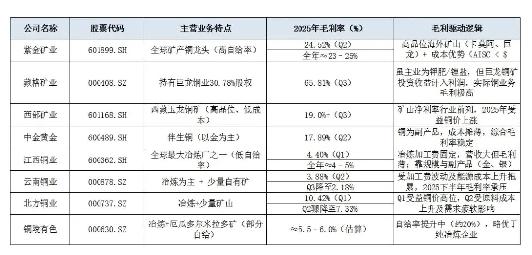 纯矿山或高自给率企业(紫金、西部、藏格):毛利率 ≥17%,甚至超60%;
