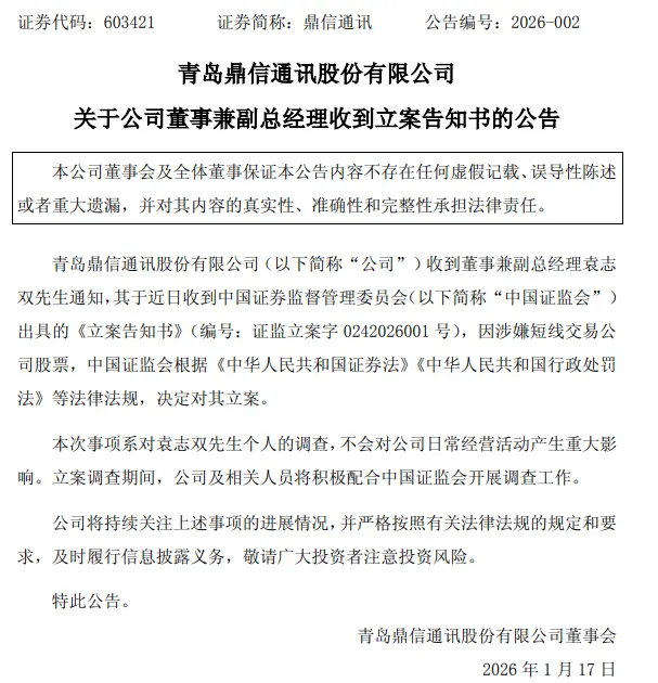 1月16日晚间,鼎信通讯(603421)公告,公司收到董事兼副总经理袁志双的通知,其于近日收到中国证监会出具的《立案告知书》,因涉嫌短线交易公司股票,中国证监会根据《中华人民共和国证券法》《中华人民共和国行政处罚法》等法律法规,决定对其立案。