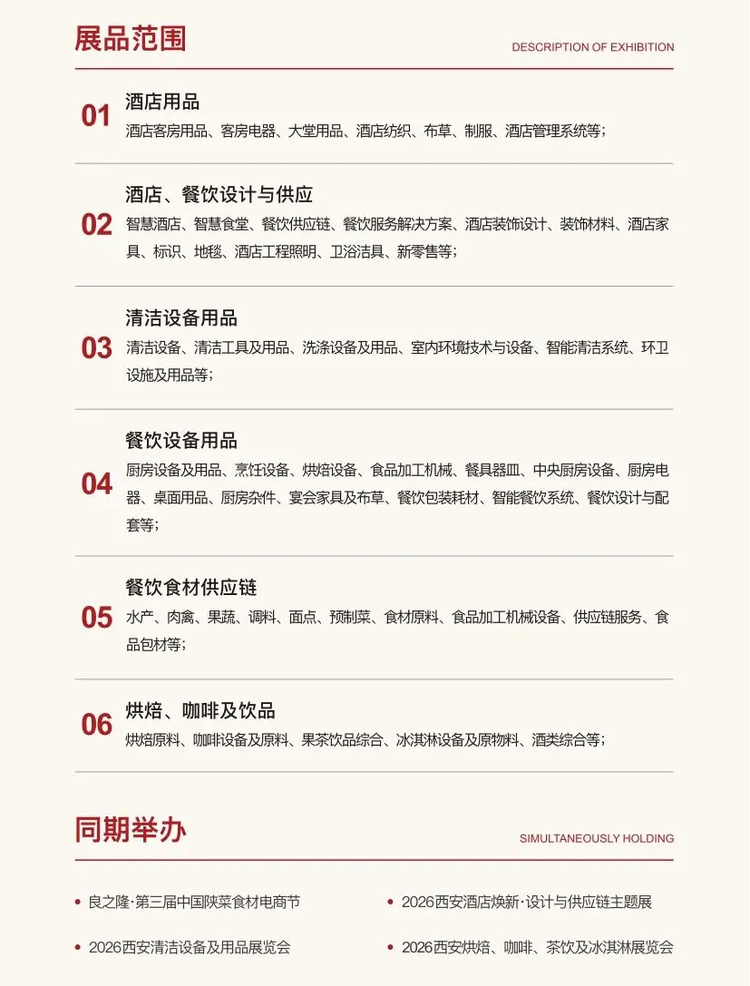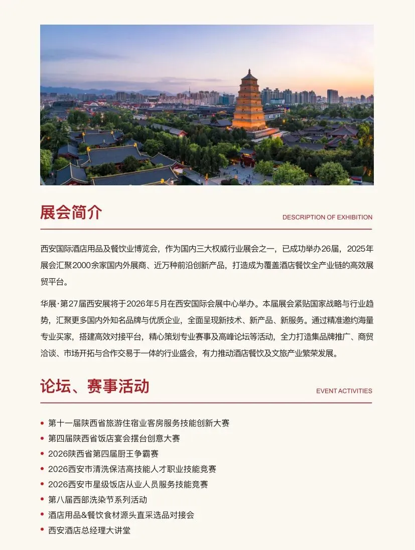 华展·第27届西安展将于2026年5月在西安国际会展中心举办。本届展会紧贴国家战略与行业趋势,汇聚更多国内外知名品牌与优质企业,全面呈现新技术、新产品、新服务。通过精准邀约海量专业买家,搭建高效对接平台,精心策划专业赛事及高峰论坛等活动,全力打造集品牌推广、商贸洽谈、市场开拓与合作交易于一体的行业盛会,有力推动酒店餐饮及文旅产业繁荣发展。