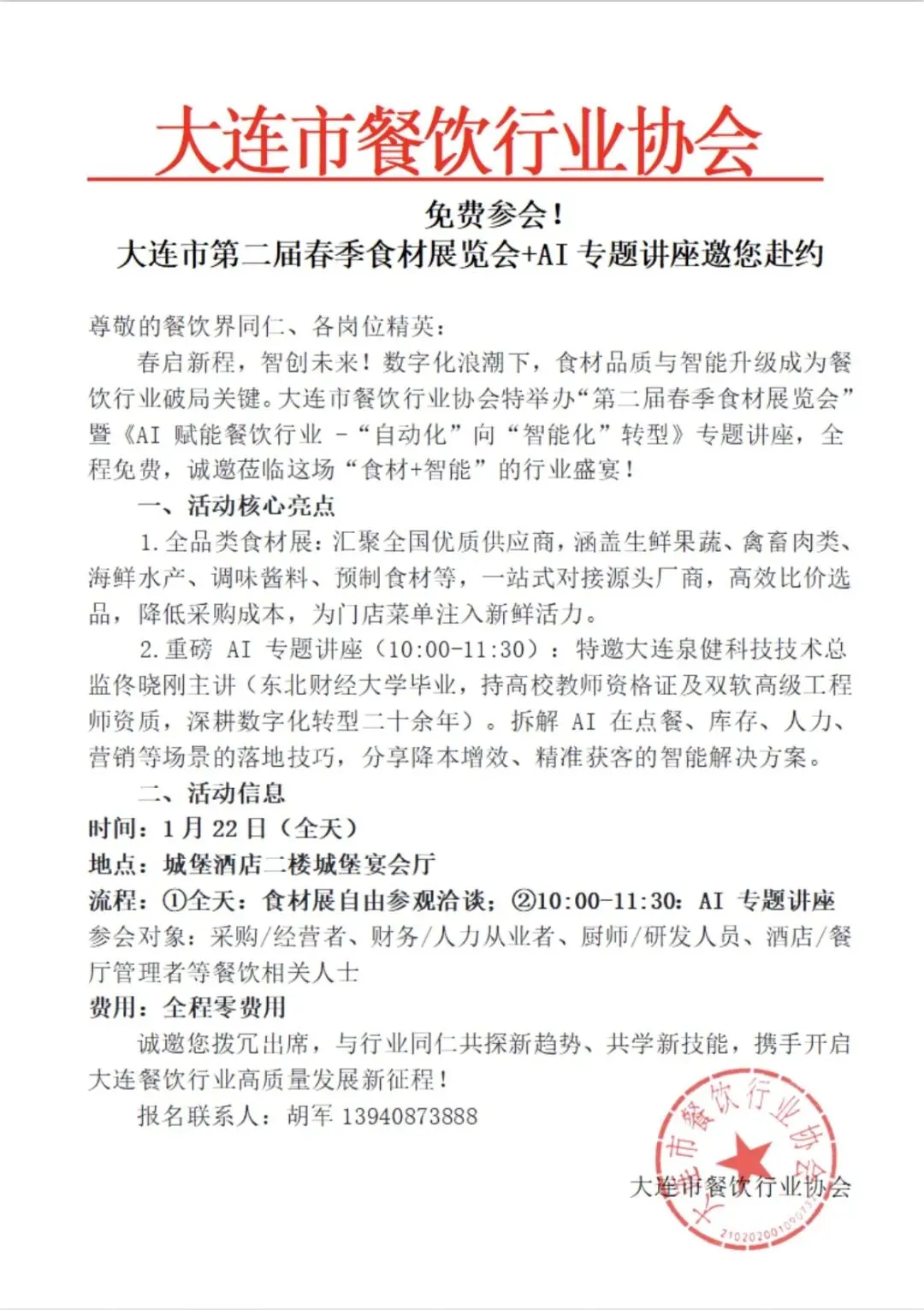 春启新程,智创未来!数字化浪潮下,食材品质与智能升级成为餐饮行业破局关键。大连市餐饮行业协会特举办"第二届春季食材展览会"暨<<AI赋能餐饮行业-"自动化"向"智能化"转型>>专题讲座,全程免费,诚邀莅临这场"食材+智能"的行业盛宴!
