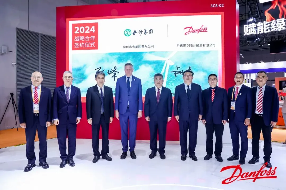 进博会上,聊城水务集团董事长王吾雪与丹麦王国驻华大使孔墨客、丹佛斯集团中国区总裁徐阳共同见证签订《关于水资源减碳示范项目的战略合作协议》。