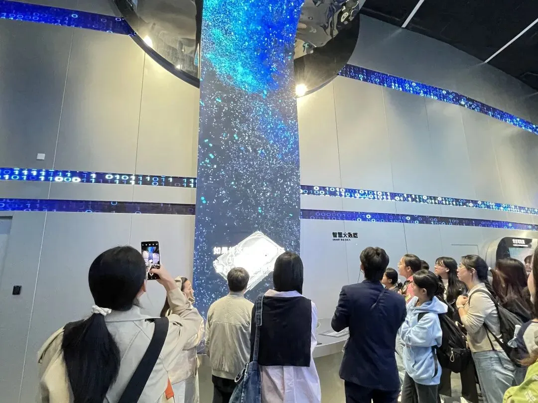 第二站,同学们前往深圳科学技术馆。作为一座长期运营的科普场所,科技馆核心目标不是销售,而是将抽象的科技原理转化为公众“看得见、摸得着、玩得懂”的内容。罗秋菊老师表示,实践教学不能只看展品本身,而要学会上下左右看展,做一个有心人,细致观察展厅的空间是如何划分和串联的,以及沉浸式场景、现场互动装置是如何服务于科普知识讲述的。