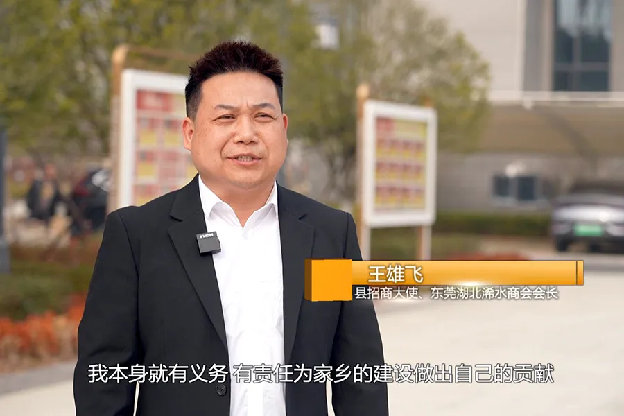 县招商大使、东莞湖北浠水商会会长 王雄飞:作为东莞商会的会长,有义务、有责任为家乡的建设做出自己的贡献。现在作为招商大使,就更有机会为家乡出力了。回到东莞之后,尽量做好家乡和东莞企业之间的桥梁,把家乡的政策宣传到东莞的企业里面去,吸引在莞的浠水籍企业家回家,为家乡的经济工作做出自己的应有的贡献。