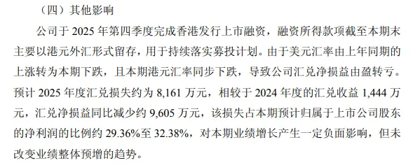 人民币兑换美元汇率,25年3季度末汇率为7.1269,4季度末为6.9764,下跌了2.14%。澜起科技半年报公布持有美元资产为50.4亿,占其现金资产83.4亿的60.4%。24年底美元资产为39.9亿,占货币资金68.4亿元的58.3%。三季度报货币资金为88.99亿,按美元资产占比61%估算,美元资产为54.3亿。按人民币4季度升值2.14%计算,货币资金产生的汇兑损失为54.3*2.14%=1.16亿元。剑桥科技发布2025年业绩预告,预告中提及4季度由于港股上市募集的资金汇兑损失8100万元。剑桥科技一共募集了52亿港元,合人民币大约46亿。澜起科技的境外资产更多,而剑桥科技的汇兑损失主要受11月12月影响,澜起还受9月份影响,汇率对澜起影响更大。澜起科技25年上半年计提汇兑损失661万元,但按公司评估,汇率变动5%汇兑损益为7500万,上半年汇率变动了2.5%,所以661万远低于预估值。上半年有想让股价上涨的动机,所以计提的比较少。目前港股上市询价在即,管理层没有想让股价上涨的动机,所以4季度可能会大幅计提汇兑损失。也许上半年没有计提的部分会一并提回,所以汇兑损失还有大于1.16亿的可能,有达到1.4亿的可能性。澜起科技采购和销售几乎全是按照美元结算,即使是境内的公司,而计算的其他业务为人民币计算,比如研发费用等。采购原材料,在采购的时候,按照当时的汇率兑换成人民币,即为存货的计入价值,也就是之后的营业成本,不会再随着之后的汇率而变动。而销售的产品,是以美元计价,当销售时的汇率下跌时,兑换回的人民币就变少了,也就是营业收入变少了。所以这个时间差,会导致毛利率和毛利润的降低。假设四季度销售的产品数量和三季度相当,来评估一下汇率对毛利润的影响。三季度营业收入为14.11亿元,营业成本为5.58亿元。由于按美元计价,销售的美元收入没有变,汇率减少2.14%,营业收入减少14.11*2.14%=0.3亿。营业成本不变,所以毛利润也减少0.3亿。股票增值权在3季度以前总共支付了3.99亿,这个在4季度要冲回。1140万股股票增值权在12月26日改为了股权激励,产生的24年和25年费用分别是,3848万和23090万元,3季度还有之前几期股份支付合计4756万元,4季度股份支付费用总共为3848+23090+4756=3.17亿。所以4季度股份支付费用为3.17-3.99=-0.82亿,对经理影响大概0.74亿。先把股份支付抛开,来评估一下利润。受汇率影响产生的损失大概为1.5亿,另外4季度的研发费用大概率高于3季度,这是澜起的惯例,如果考虑4季度研发费用比三季度高0.4亿,那么,这几项总共影响营业总成本1.9亿,大概影响1.8亿净利润。按3季度剔除股份支付后的净利润为8.1亿考虑,如果四季度销售没有增量或者微增,那么剔除股份影响之后的净利润就是6.3亿。将股份支付的影响考虑进去,那么净利润就是6.3+0.7=7亿。澜起科技2025年第四季度单季净利润仅为5.2亿至7.18亿元。按上节的分析,如果4季度销量和3季度持平情况下的净利润是7亿,落在预告区间上限位置。那么可以大概知道,4季度的销量比3季度不会有大的提升。至于最终净利润为多少,现在还有不确定性。如果净利润低于7亿,低出去的部分是由于销量下降导致还是计提了其他费用导致?4季度存储价格暴涨,这样会压制对存储量的需求,澜起的收入受存储销量影响比较大,销量环比不再增长也是可以理解。汇兑损失是短期一次性的,对公司的内在价值影响很小。可以判断的是,行业景气度没有变化,行业格局没有变化,未来的增长预期没有变化。短期的股价可能承压,因为投资者还不知道业绩不及预期的原因是什么,但是影响肯定小于10月31日。10月31日公布3季度业绩后股价大幅下挫10个多点,之后走入了阴跌模式,是市场对股票增值权的担忧,因为股票增值权会长期影响股价。但是12月26日股票增值权改为限制性股权激励后,股价也没有涨,是市场已经开始预期4季度业绩了。从卖方研报来看,在中报出来后,普遍给出的全年净利润预期是25亿左右,在3季度报出来以后普遍给的预期是22亿。在股票增值权更改后的研报,也维持了22亿左右的预期。股价是中报前后,大幅上涨,3季度报后走入下跌模式。其他存储,股价都已经新高,高于9月末10月初的股价,而澜起科技目前股价比10月30日的股价还低6%,所以明天的冲击也不会太大。对于场外投资者,如果大幅下跌是加仓的好机会;对于场内的投资者,长期投资的可以忽略影响。在港股询价完成后,大概率还会出业绩快报,那时会有更多的业绩解释。当然,以上分析更多的是基于推理,请谨慎看待。具体的情况,还有等待澜起的官方报告。