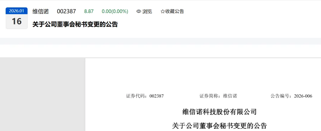 维信诺科技股份有限公司(以下简称“公司”)董事会于2026年1月15日收到董事会秘书徐凤英女士提交的书面辞职报告。徐凤英女士由于工作调整原因申请辞去公司董事会秘书职务(原定任期结束之日为2027年5月21日),辞职后仍在公司担任副总经理职务。根据《公司法》《深圳证券交易所上市公司自律监管指引第1号——主板上市公司规范运作》及《公司章程》的相关规定,徐凤英女士的辞职报告自送达董事会之日起生效,徐凤英女士已严格按照公司制度完成董事会秘书相关工作的交接,其辞职不会对公司生产经营产生影响。