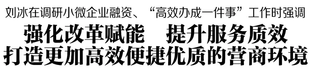 3月5日上午,市委副书记、市长刘冰调研小微企业融资、“高效办成一件事”工作,强调要认真贯彻落实省委书记刘宁莅焦调研指示精神,坚持以市场主体和人民群众满意为根本目标,强化改革赋能、提升服务质效,下大气力解决小微企业融资难题,扎实推进“高效办成一件事”,打造更加高效便捷优质的营商环境,不断提升企业和群众的获得感、满意度。