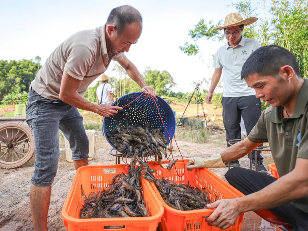 ▲高要区莲塘镇温贯村养殖户收获罗氏沼虾。陈彦成 摄