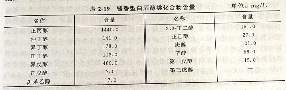 酱香型白酒的总醇含量较高 (表 2-19)。在醇类化合物中,尤以正丙醇含量最高,这与其爽口性有很大的关系。同时,醇类化合物含量高还可以起到对其他香气组分“助香”和“提扬”的作用。
