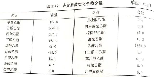 自1964 年原轻工业部组织茅台试点工作,到 1976 年,大连物理化学研究经已止%食品发酵工业研究所和内蒙古轻化汇研究所等儿家科研单位陆续对酒的香味组分醇、酸、酣、炭基化合物进行了分析研究。普香的茅台酒己酸乙酷含量并不高 (见表 2-17),一般在 400500mB/1间。茅台满的带类化合物组分很多,含量最高的是乙酸乙酷和乳酸乙酶。已酸;在众多种类的酶类化合物中并没有突出它自身的气味特征。同时,酷类化合物他组分香气相比较,在茅台酒的香气中表现也不十分突出。