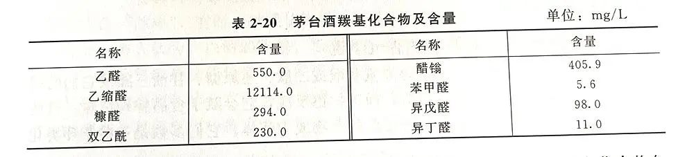 茅台酒中炭基化合物总量是各类香型白酒相应组分含量之首(表 2-20)。特别是糠醛的含量,它与其他各类香型白酒含量相比是最多的;还有异戊醛、丁二酮和醋输含量也较多。这些化合物的气味中有一些焦香与湖香的特征,这与茅台酒香气有相似之处。