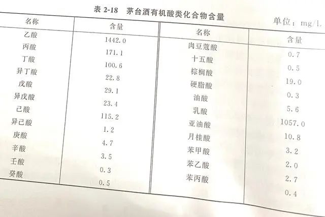 茅台酒中酸含量见表 2-18。酱香型白酒的有机酸总量明显高于浓香型和清香型白酒。在有机酸组分中,乙酸含量多,乳酸含量也较多,它们各自的绝对含量是各类香型白酒相应组分含量之冠。同时,有机酸的种类也很多。在品尝茅台酒的D味时,能明显感觉到酸味,这与它的总酸含量高,乙酸与乳酸的绝对含量高有直接的关系。