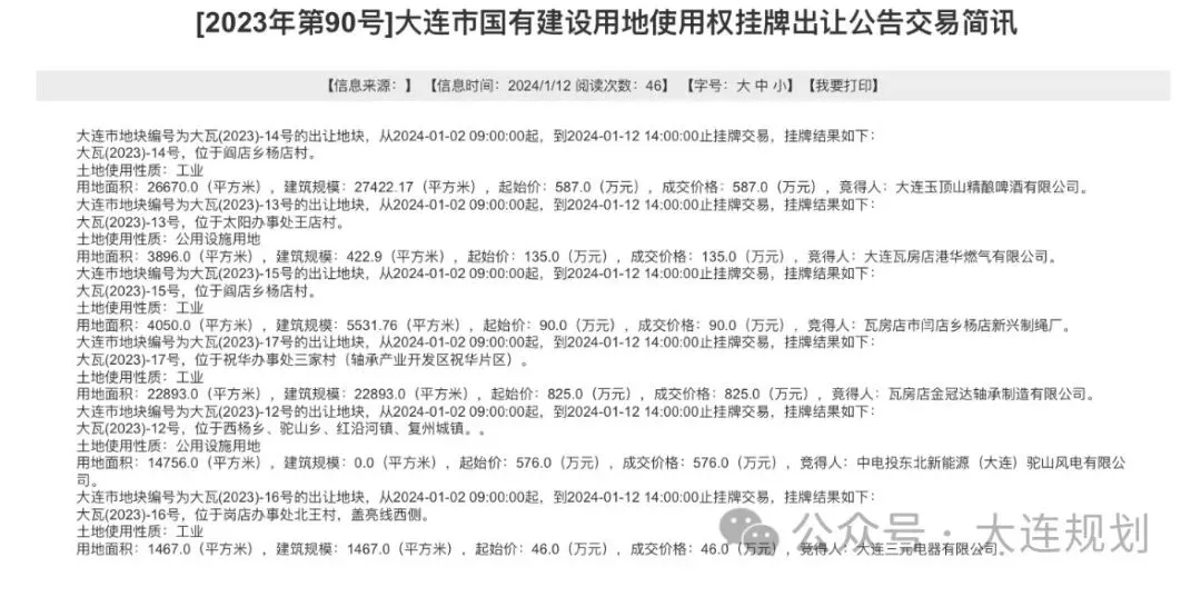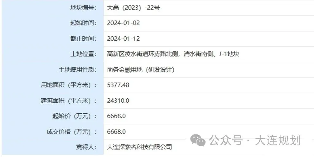 继元旦节日后首个工作日,大瓦(2023)12-17号工业用地完成落槌后,1月12日下午,大连探索者科技有限公司以底价6668万元摘得大高(2023)-22号商务金融用地。