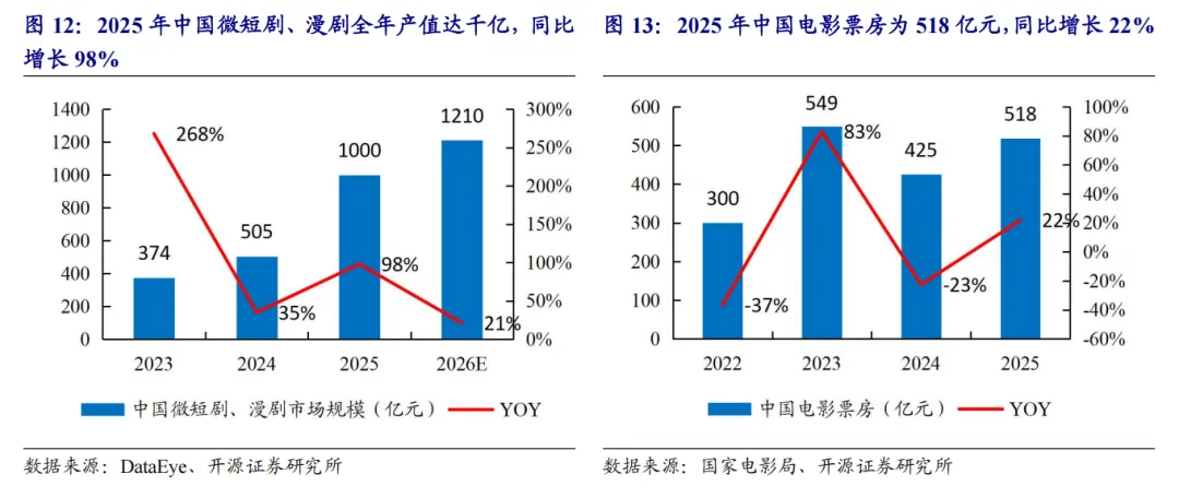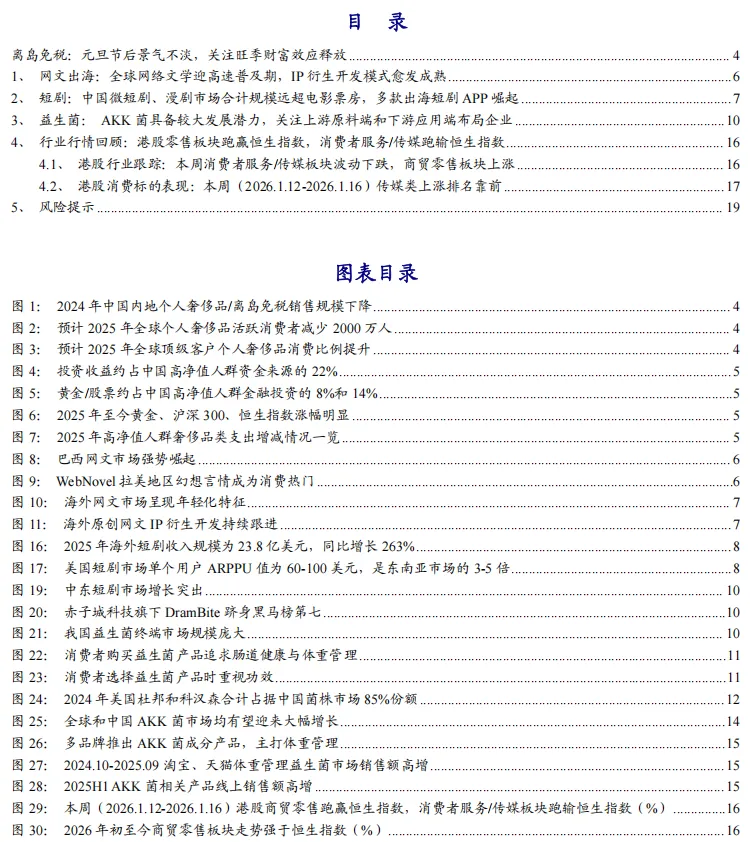 1、离岛免税:元旦节后景气不淡,关注旺季财富效应释放国内奢侈品零售营收逐季改善,中高端消费复苏趋势明显。中国奢侈品市场经历2024年震荡走弱后,各奢侈品龙头自2025Q2起营收增速迎来筑底修复,其中2025Q3LVMH 、爱马仕、历峰集团、PRADA等高端零售龙头亚太营收实现正向增长。高净值人群资产增值和消费信心修复或为重要驱动。高净值人群是高端消费市场的主要支撑,根据贝恩,受到全球宏观经济波动影响,2025年全球个人奢侈品活跃消费群体约3.3亿人,较2022年减少约7000万人,其中顶级客户(年消费额超过2万欧元)购物支出预计占总奢侈品消费额的46%以上,较2022年增加6pct。截至1月16日,恒生指数/沪深300/黄金较2025年初累计上涨37%/24%/131%,资本市场走强将产生明显的财富效应,对于提振消费增速整体有利,特别是高净值人群保值类奢侈品消费边际消费倾向提升较为明显。新政红利叠加优惠券刺激,封关后免税消费景气延续。免税商前期积极备货叠加政府消费券精准投放,封关后如黄金、IPhone17等畅销折扣产品迎来消费高峰,刺激赴岛购物客流同比向上复苏。根据海口海关,封关后截至2026年1月上旬,离岛免税购物金额38.9亿元,购物人数58.5万人次,同比分别增长49.6%、32.4%,测算隐含人均客单同比增长13%,转化率或迎来实质拐点。离岛免税是中高端消费的主要渠道之一,海南近年加强头部高端品牌卡位和体验型零售业态培育,预计将深度收益高端消费回暖趋势。2、网文出海:全球网络文学迎高速普及期,IP衍生开发模式愈发成熟全球网文市场多级增长,拉美市场崛起。2024年中国网络文学市场营收规模达495.5亿元,同比增长29.37%,连续三年增速加快;同期海外市场营收规模为48.15亿元,同比增长10.68%。2025年网络文学迎来全球高速普及阶段,截至2025年10月31日,WebNovel(起点国际)全球累计访问用户已近4亿,培育孵化了来自全球的近53万名作家、超82万部原创作品,作品总量同比增长20%,其中阅读量突破千万级的爆款已达538部。在WebNovel全球月活用户增速前十名的国家中,有九个席位被拉美国家占据,其中巴西市场以779%的增速领跑,其用户访问量跃升五位,和美国、印度包揽全球访问量前三;同时美国市场用户规模同比增长91%,接近翻倍,成熟市场活力不减。全球创作力量正呈现出显著的年轻化趋势。在WebNovel的签约作者中,00后占比达50%,05后作者规模同比增长55.9%。这一生态不仅体现于创作与阅读,更演化为一个高黏性的精神家园——平台年评论互动量累计突破1400万条,同比增长40%。中国IP产业模式也应用于海外,推动海外原创IP的产业链开发。以起点国际年度征文大赛(WSA)为例,历届获奖作品中,超七成作品已进入IP开发。由往届获奖作品《我的吸血鬼系统》改编的有声书播放量达11亿、漫画也已上线。2025年WebNovel及WSA还增设了“年度之书”“漫画改编奖”等荣誉,获奖作品可直通漫画、有声及短剧等多元改编。3、短剧:中国微短剧、漫剧市场合计规模远超电影票房,多款出海短剧APP崛起2025年中国微短剧、漫剧全年产值达千亿,远超此前600亿元左右的市场预期,免费短剧&漫剧引领增长。根据DataEye研究院数据,2025年中国微短剧、漫剧市场规模为1000亿元,同比增长98%,同期全国电影总票房为518亿元,微短剧、漫剧市场体量已接近电影票房的两倍。DataEye研究院预估,2026年中国微短剧、漫剧市场规模保守估计将突破1200亿。这一轮快速增长,主要得益于免费微短剧市场的持续扩容,以及漫剧赛道的异军突起。2025年,免费真人微短剧市场规模超500亿,约占真人微短剧整体市场的比重约达三分之二;漫剧市场规模估计接近200亿元。中国微短剧用户接近7亿,逆袭题材最为火热。截至2025年6月,全国微短剧用户规模已达6.96亿,占网民总数比重接近七成。女性用户的偏好度(TGI)高达159,而男性用户仅为71,女性用户对微短剧的偏好程度与使用粘性均远高于男性群体。从年龄角度来看,19岁及以下用户粘性最高,TGI达180;40-49岁中年用户紧随其后,TGI为131;20-29岁用户位列第三,TGI达128。这说明微短剧不仅牢牢抓住了年轻核心受众,同时也成功撬动了中年群体的消费兴趣。“逆袭”题材热力值达143.9亿,短剧数达5178部,在“热度规模”和“作品数量”上均为绝对第一,是微短剧最核心的赛道。“现代”与“打脸虐渣”两大题材表现亮眼。2025年海外短剧市场迎来加速增长,从用户渗透层面仍有较大发展空间。根据Appfigures统计数据,2025年海外短剧收入达到23.8亿美元,下载量突破12.1亿次,同比分别大幅增长263%和135%。进入第三季度后,市场彻底进入稳定放量阶段:月下载量常态化突破1亿次,下半年月收入连续站上2亿美元关口,海外短剧由探索期迈入规模化增长的新阶段。根据霞光智库2025年9月发布的《2025中国短剧出海报告》,目前全球短剧的月活跃用户约为8000万,但与近9亿的潜在用户规模相比,当前的渗透率仍不到一成。收入前三强ReelShort(中文在线)、DramaBox(点众科技)与GoodShort(新悦时代)合计占据超53%的市场份额,整体市场集中度依然较高。“准头部”力量正在形成。Dramawave、NetShort排名提升均在10位以上,年收入接近2亿美元,显示出较强的产品实力与持续增长潜力。中东成为全球短剧增长最突出的区域,赤子城科技旗下DramaBite跻身黑马榜第七。收入端,土耳其同比增长超1018%,从160.8万美元增至1799.3万美元,沙特以近884%的增速紧