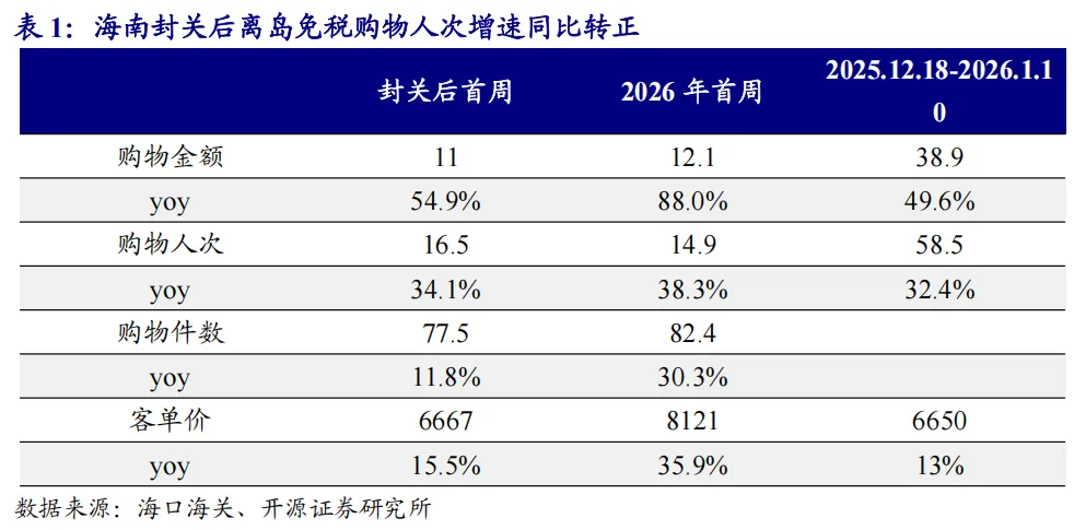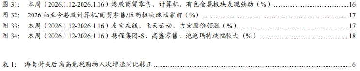 免税/网文IP:元旦节后离岛免税景气不淡,全球网络文学迎高速普及期海南跟踪:中国奢侈品市场龙头自2025Q2起营收增速迎来筑底修复,资本市场走强将产生明显的财富效应,对于提振消费增速整体有利,特别是高净值人群保值类奢侈品消费边际消费倾向提升较为明显。根据海口海关,封关后截至2026年1月上旬,离岛免税购物金额38.9亿元,购物人数58.5万人次,同比分别增长49.6%、32.4%,转化率或迎来实质拐点。海南近年加强头部高端品牌卡位和体验型零售业态培育,预计将深度受益高端消费回暖趋势。