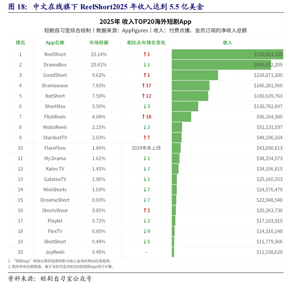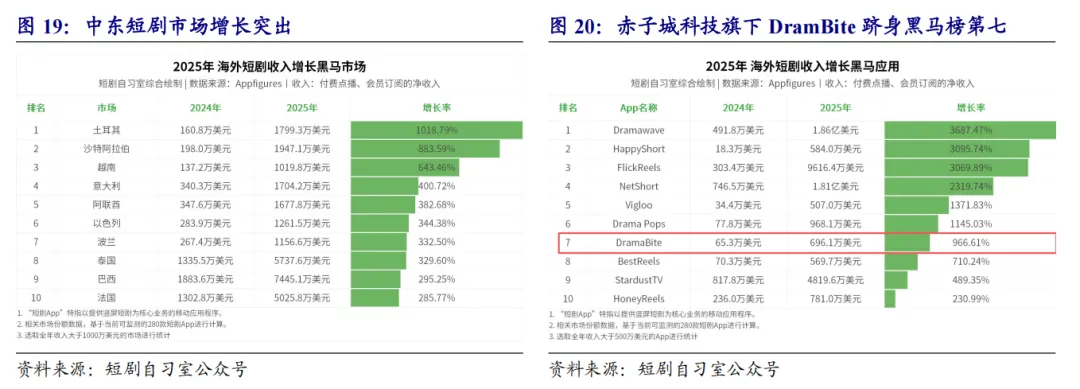 2025年短剧市场呈现国内外双轨高速增长态势。国内微短剧、漫剧市场规模达1000亿元,同比增长98%,体量接近电影票房两倍,免费短剧与漫剧成增长核心,2026年预计突破1200亿元。用户端规模逼近7亿,女性及19岁以下、40-49岁群体粘性突出,“逆袭”题材以143.9亿热力值领跑。海外市场同样表现亮眼,全年收入23.8亿美元、下载量12.1亿次,同比分别增长263%和135%,下半年月收入稳超2亿美元。头部格局集中,ReelShort、DramaBox等前三玩家占全球超53%收入,中东市场成增长引擎,土耳其、沙特收入增速超880%,赤子城科技旗下DramaBite跻身全球收入增长黑马榜第七,行业已从探索期迈入规模化增长新阶段。