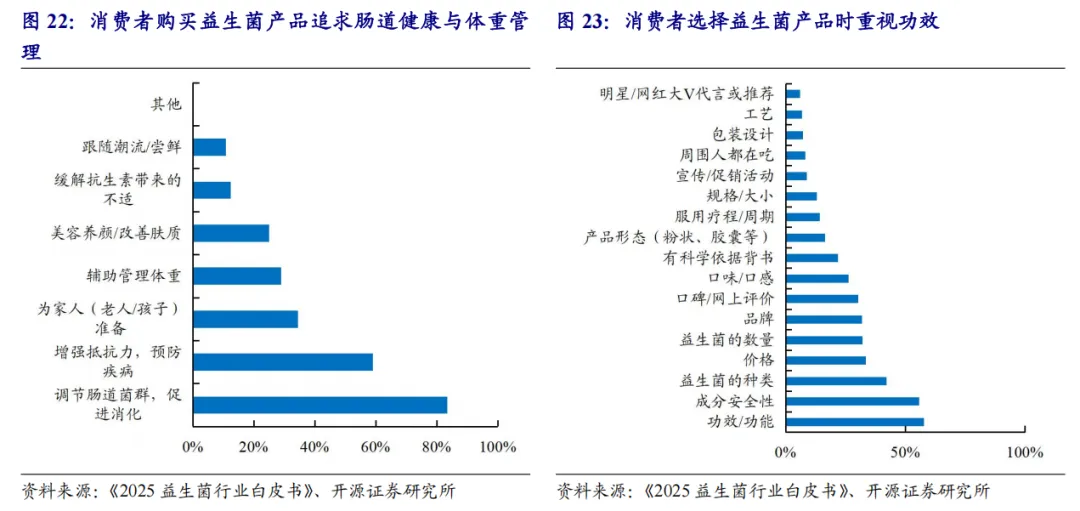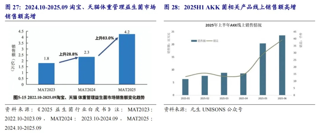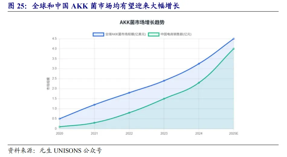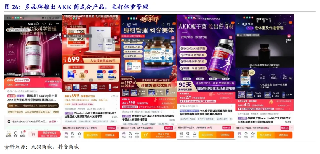 益生菌:AKK菌具备较大发展潜力,关注上游原料端和下游应用端布局企业益生菌产品从传统的消化健康范畴向体重管理、皮肤健康等新兴细分领域扩张。国产菌株原料企业起步较晚,但部分企业通过自主研发已经实现部分新一代菌株的量产。新一代益生菌(NGPs)如拟杆菌属、AKK菌和产丁酸菌等通过现代科技手段进行优化或改良,具有一代没有的功效性,可调节炎症性肠病、代谢、免疫等。AKK菌在肠道健康、代谢调节、免疫功能等方面潜力较大,被誉为 "下一代益生菌之星"。善恩康主打的AKK活性益生菌于2025年2月14日成功通过美国GRAS安全认证审查,可以出口到美国以及认可美国 GRAS 认证的其他国际市场按传统食品和饮料原料销售。下游保健品、膳食补充剂品牌正加速布局AKK益生菌为核心成分的产品,如WonderLab、茵澳斯等。国内若羽臣旗下平价成分党跨境保健品品牌Nuibay 2026年1月7日正式上线AKK菌新品,原价599元,实际售价228元/30粒。受益标的:倍加洁、若羽臣。